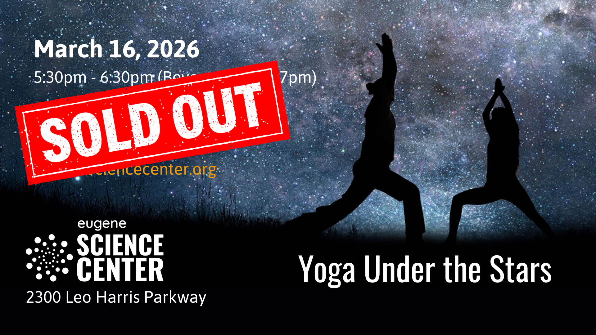 YOGA UNDER THE STARS Where: Eugene Science Center's Planetarium When: March 16, 2026, 5:30-6:30pm (social time until 7pm) Price: $30 General Admission, $25 Members (Sold Out) Spaces are limited to…