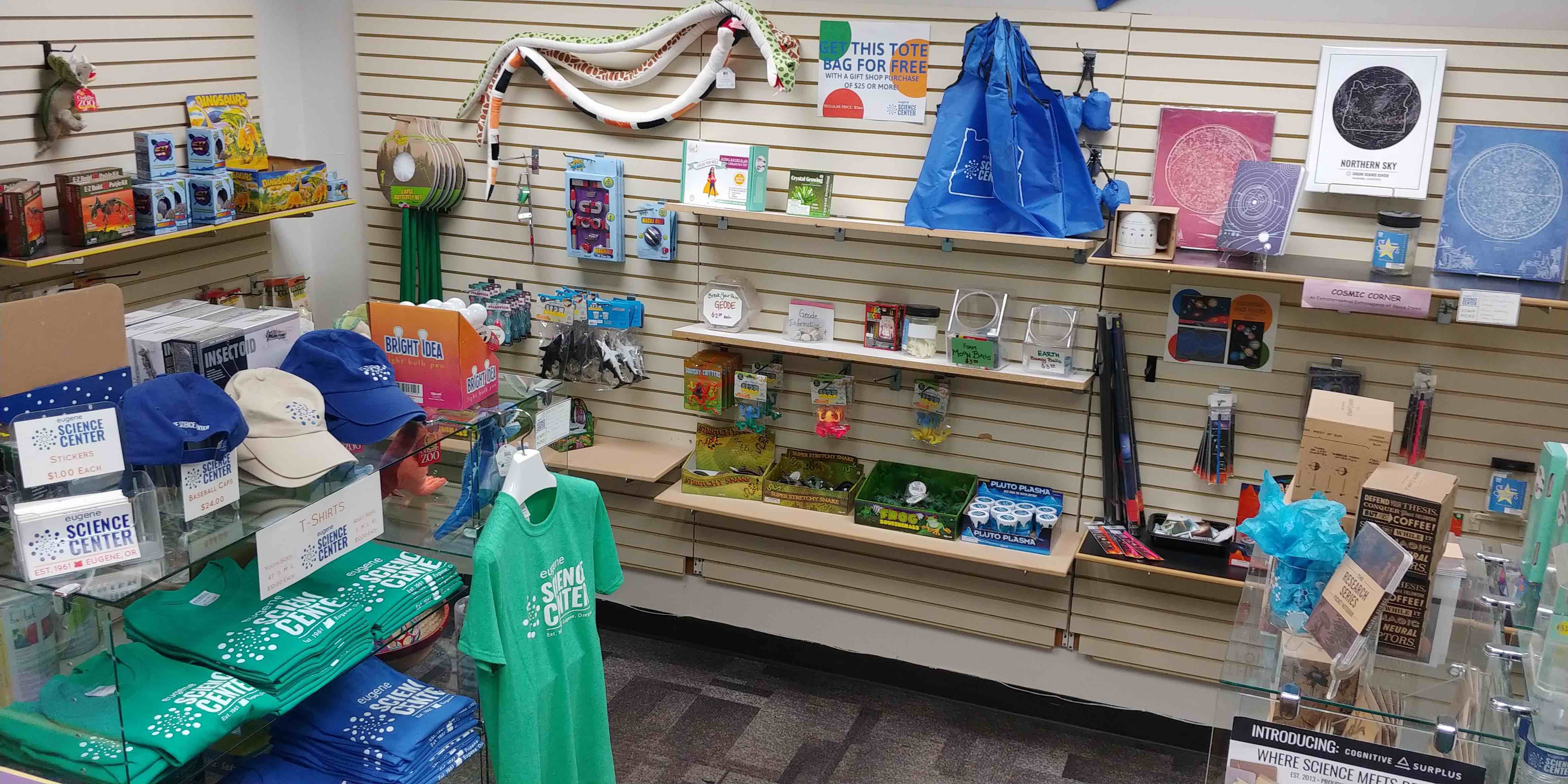 Shop in our store for unique, science-themed toys and gifts. Pick up a souvenir to remember your science center visit, or find a gift for your science-fanatic friends and family. The science center store has great items to choose from including science kits, toys, books, t-shirts, and more. It also offers snacks and cold beverages.